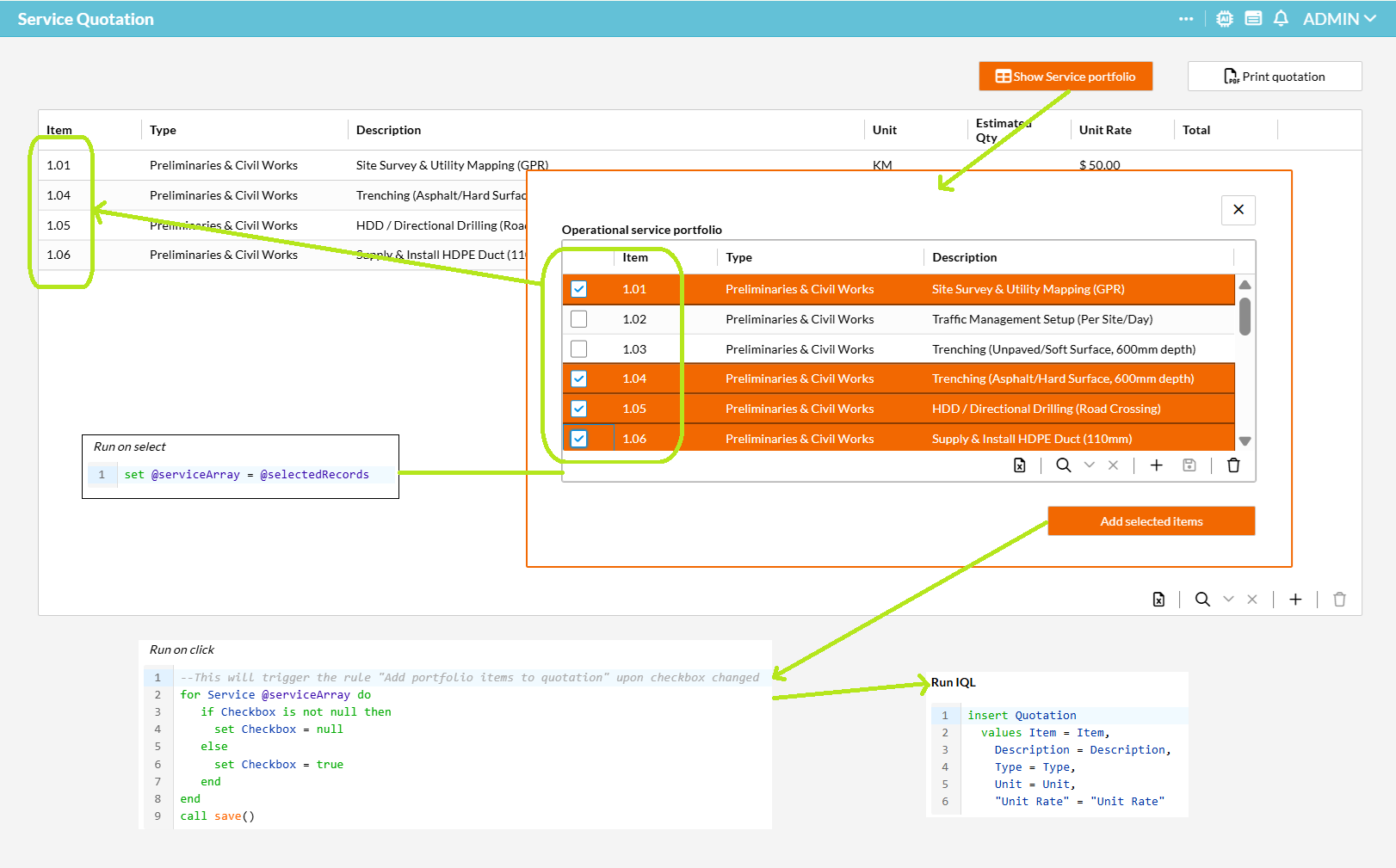 An array is a data structure designed to manage collections of elements. In IQL, this means you can now handle multiple records simultaneously, opening up new workflow possibilities. For example: Imagine having a form where you can select multiple rows from a service portfolio and instantly integrate them into a quotation.