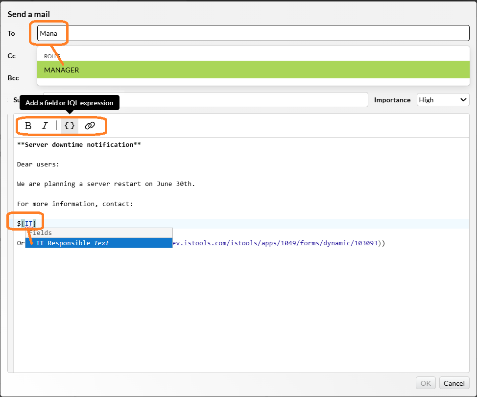 You will be able to use this modern and user-friendly interface when you use the actions “Send a notification”, “Send a mail” and “Send an SMS” in the Rules manager, providing you with autocompletion to instantly find matching contacts, fields, or IQL expressions as you type, reducing errors and speeding up your configuration, among other benefits.